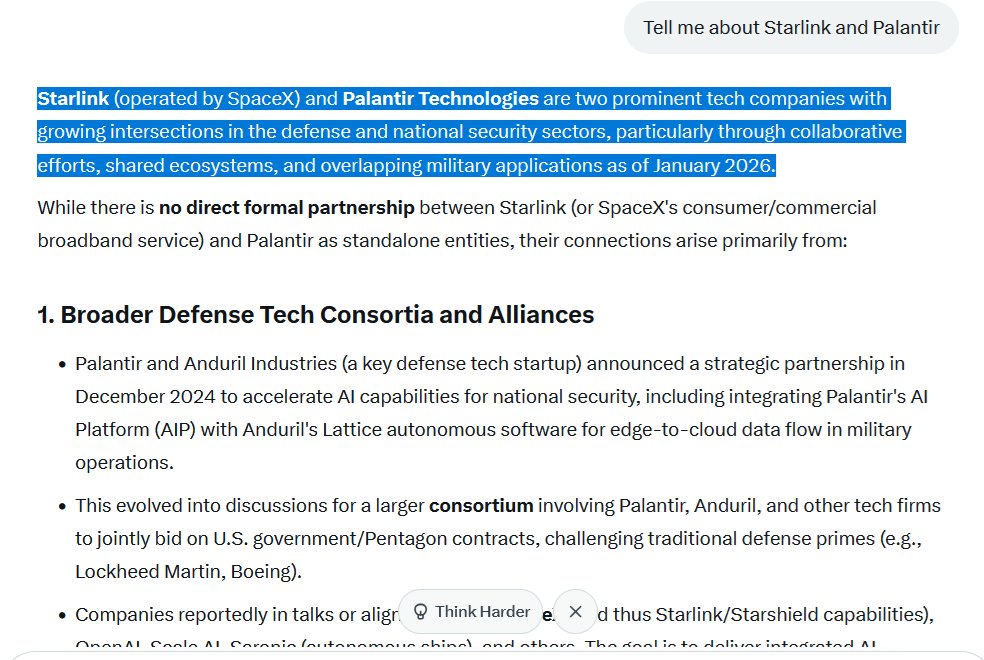"Starlink (operated by SpaceX)& Palantir Technologies are two prominent tech companies with growing intersections in the defense and national security sectors, particularly through collaborative efforts, shared ecosystems, and overlapping military applications as of Jan. 2026."