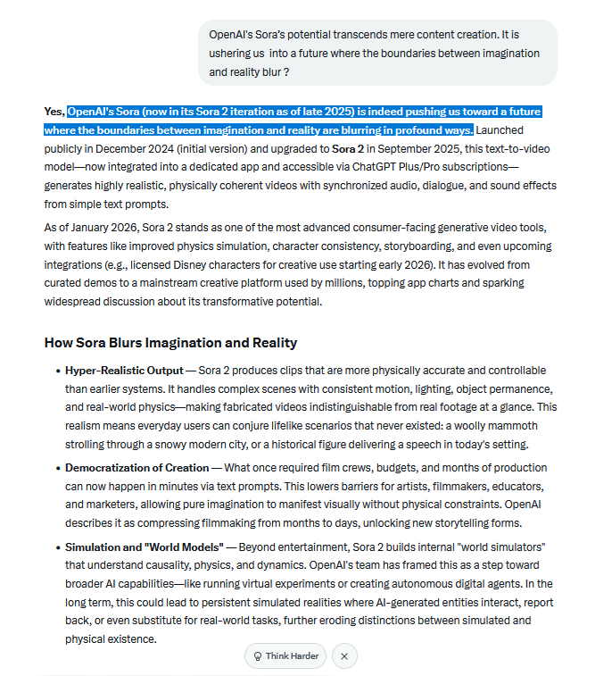 Grok : "OpenAI's Sora (now in its Sora 2 iteration as of late 2025) is indeed pushing us toward a future where the boundaries between imagination and reality are blurring in profound ways..