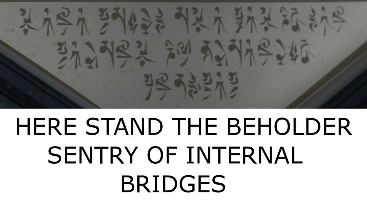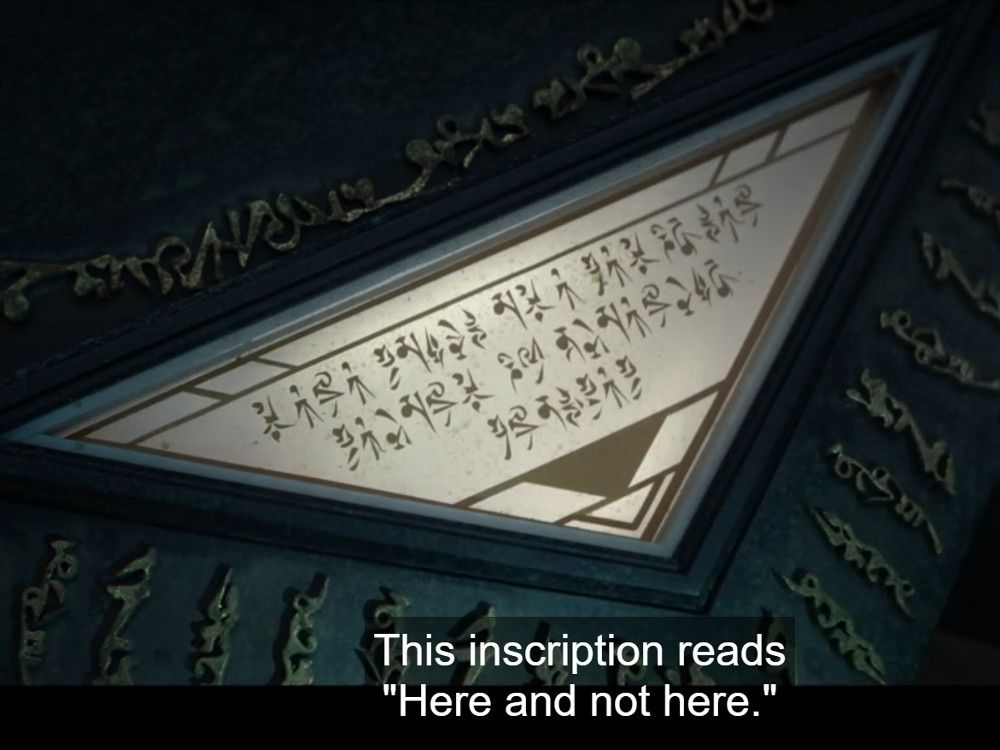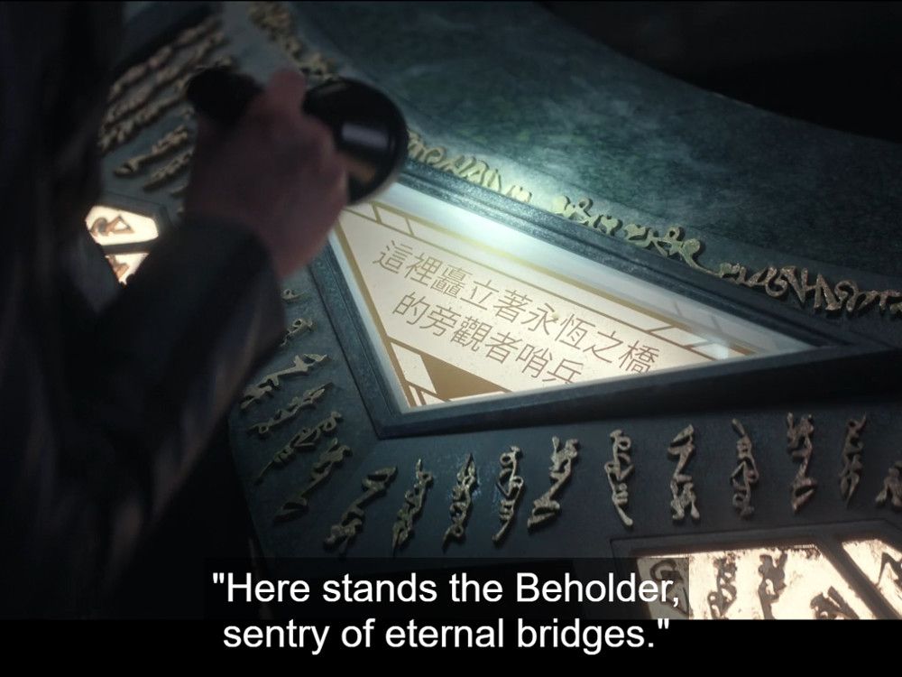 Uhura is wrong about the meaning of the alien text inside the building (1st pic). It's actually just the same text seen in Chinese earlier in the episode (2nd pic) with two small differences (3rd pic): "stands" becomes "stand" and "eternal" becomes "internal". ;-) 3/5