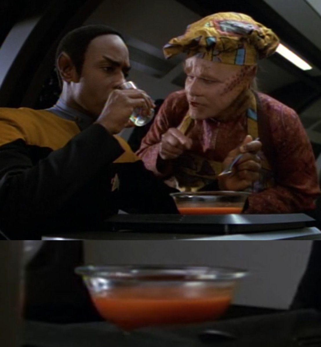 Plomeek soup appears in three #StarTrekDS9 episodes ("The Maquis I"⬆️, "The House of Quark"↙️, "The Die is Cast"↘️). In each appearance, it appears more like a chunky, yellow stew. In "The House of Quark" (ordered by Bashirwith a touch of basil), it appears orange-brown. 2/8