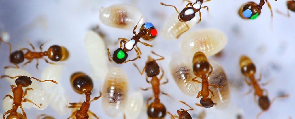אבל עם כל החריצות הזאת, איך הן לא השתלטו על העולם עדיין?!?! אה! (איפה רפי גינת וכולבוטק כשצריך אותו). אז דניאל בדק. הוא סימן נמלים סטטיות בצבעים שונים. נמלים מכל מיני ״מחלקות״ סומנו ונצבעו בצבעים שונים. הוצבו מצלמות ומעקב יום יומי וסומנו כל העת ״נמלים עצלניות״ עד שמופה כל הקן🔽