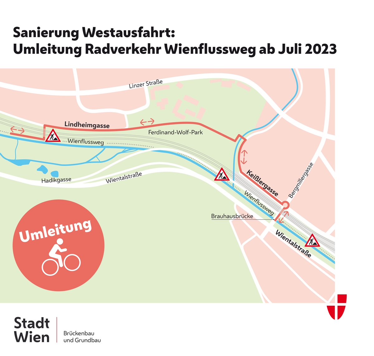 Radverkehr wird ab Juli 2023 ebenfalls umgeleitet. Ab Brauhausbrücke geht es in die Bergmillergasse, dann weiter durch Keißlergasse, Ferdinand-Wolf-Park, Lindheimgasse und zurück auf den Wientalradweg. Für Fußgänger*innen bleibt Naherholungsgebiet Wienfluss weiter zugänglich. 7/8