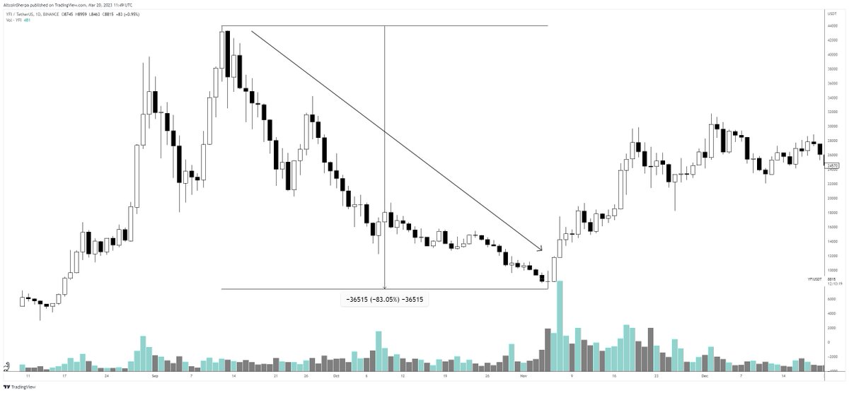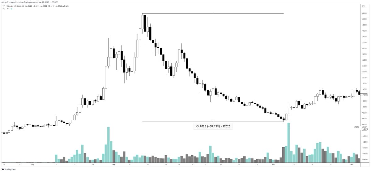 After the big summer run, the Fall of 2020 provided a strong cooling period for many altcoins after their run. Many of them retraced bigtime, with DeFi coins going down a ton. All of this was happening while BTC was starting to have its epic run.