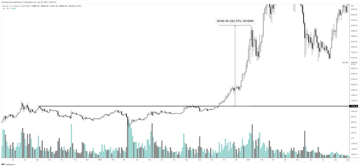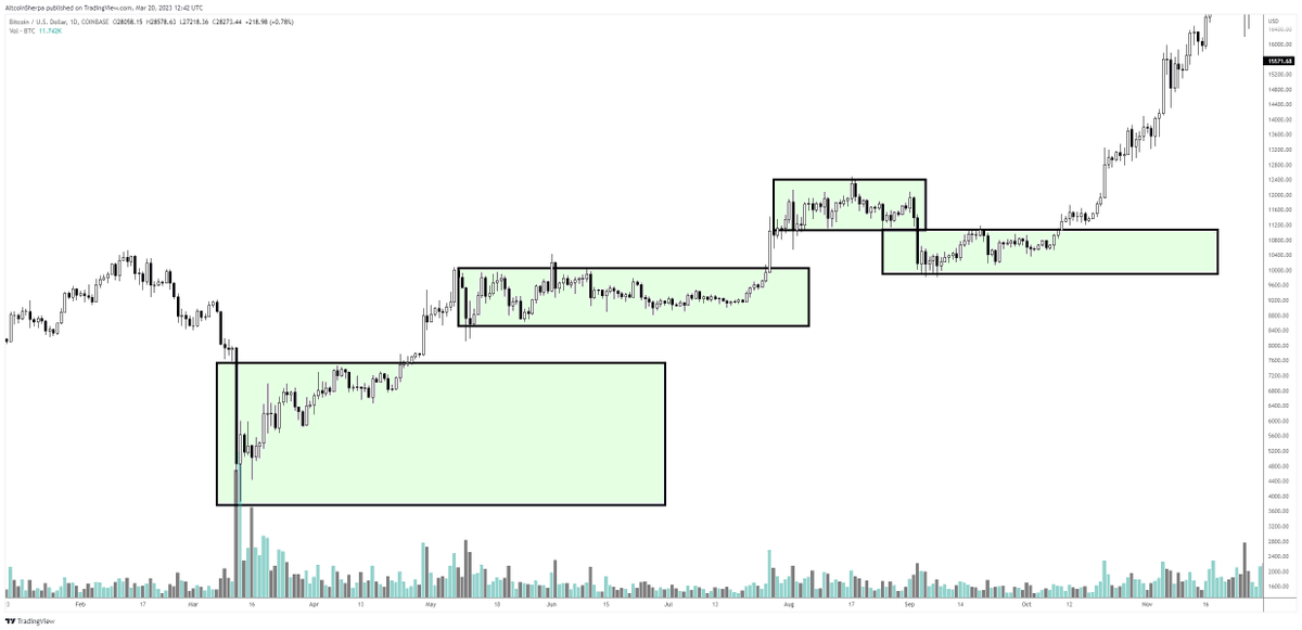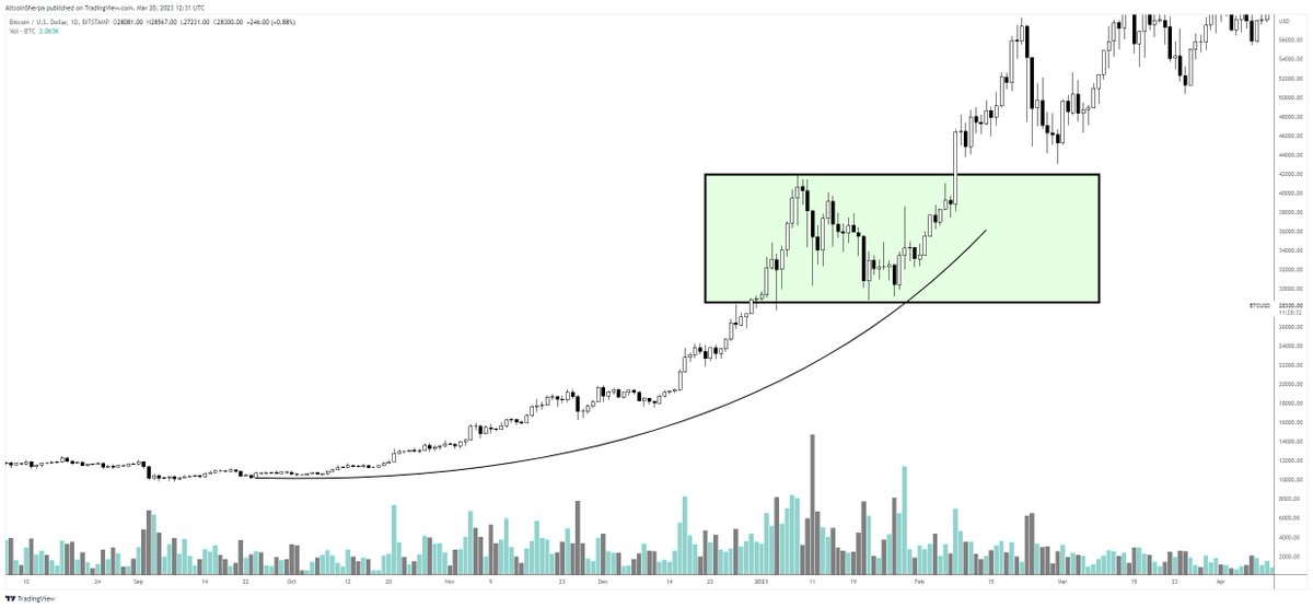 To be clear, I don't think that the current cycle is going to be nearly as strong as 2020. That was a massive run from 10-60k, where btc accumulated for most of 2020 and collected A LOT of liquidity on the March 2020 crash.