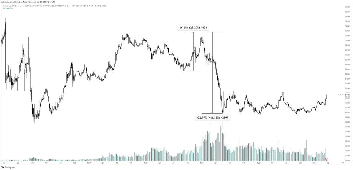 Alt/btc pairs got destroyed for 2 years straight and btc.d was very high (relatively).