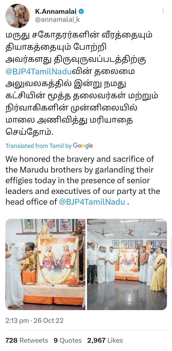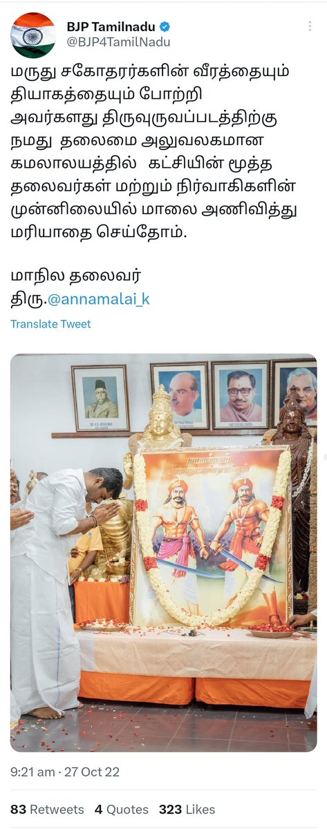 In an old tweet by BJP Tamil Nadu president @annamalai_k, You can see him bowing Maruthu Pandiyar brother's potrait. Not sure if he tried teaching history his good friend in Karnataka Mr. @CTRavi_BJP 🤭