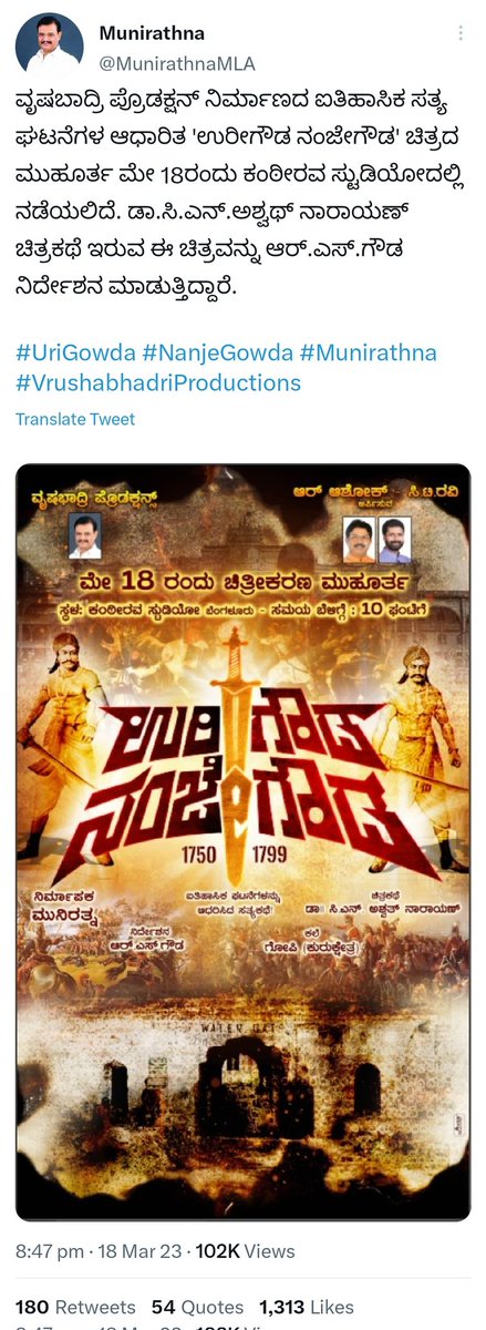 Karnataka Minister & film producer Munirathna @MunirathnaMLA later made a U-turn & said he decided against making the film titled Uri Gowda-Nanje Gowda. Not sure if he still know that images used are of Maruthu Pandiyar brothers. 🤐