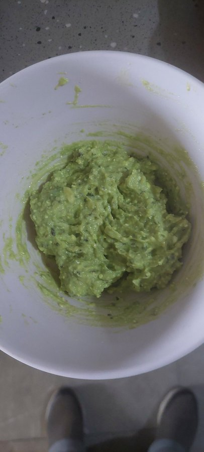 Coloca en un pequeño bol medio aguacate mas una cucharada de azufre con grado alimenticio, aceite de oliva y sal al gusto.