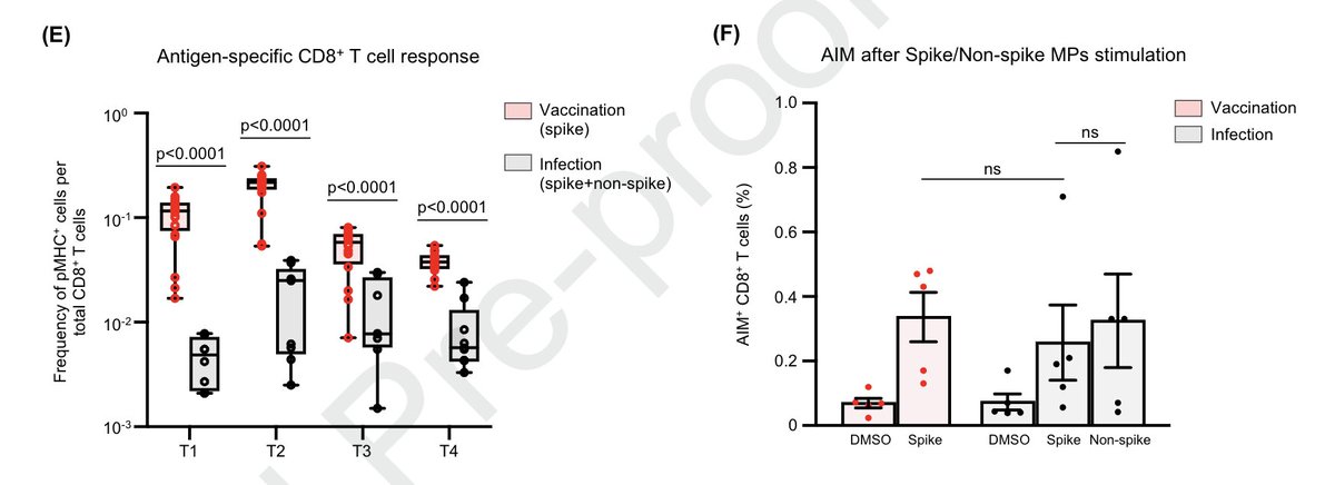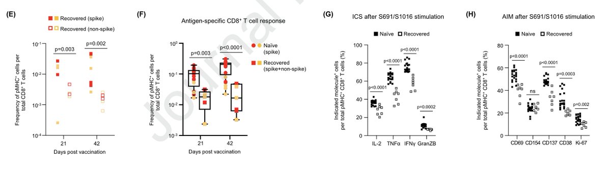 Then comes the hybrid immunity bit: what happens to T cells when people who recovered get the vaccine? Here we see that the total response (not though this isn't an AIM assay) is smaller compared with naive patients. So- is that it? COVID wrecked their CD8 T cells?
