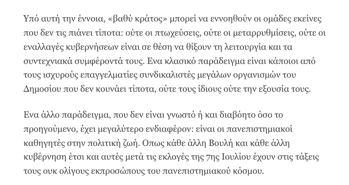 Να προσθέσουμε και τον ρόλο που παίζουν διάφοροι δημοσιογράφοι και "οργανικοί διανοούμενοι" στην Ελληνική μετάφραση και οικειοποίηση του όρου. Για τον κ. Μαλούχο π.χ. το βαθύ κράτος αφορά τους συνδικαλιστές και τους πανεπιστημιακούς που πολιτεύονται. in.gr/2019/08/22/apo…