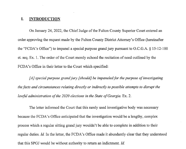 First, some history: On 1/24/22, the Chief Judge in Fulton County entered an order approving the request for a SPGJ - the order basically copied the need that the DA had presented. They needed the SPGJ, they said, because the investigation would be so long and complex that a… twitter.com/i/web/status/1…