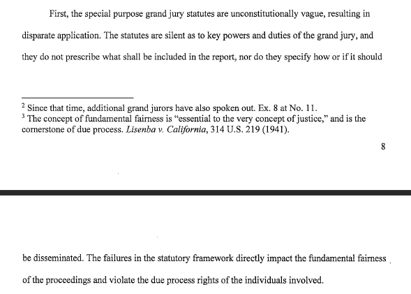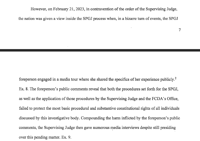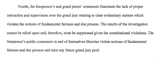 But, alas, that didn't happen. The foreperson went on a media blitz, sharing her experience publicly. As per the filing, the public comments demonstrated that the constitutional rights of the individuals who testified weren't protected.