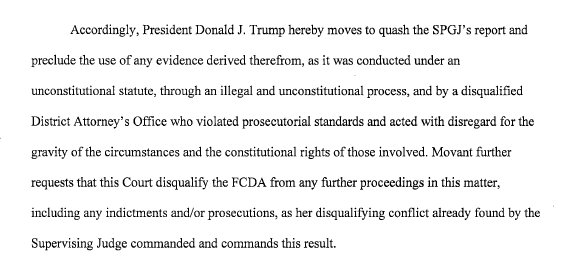 "Accordingly, President Donald J. Trump hereby moves to quash the SPGY’s report and preclude the use of any evidence derived therefrom, as it was conducted under an unconstitutional statute, through an illegal and unconstitutional process, and by a disqualified District… twitter.com/i/web/status/1…