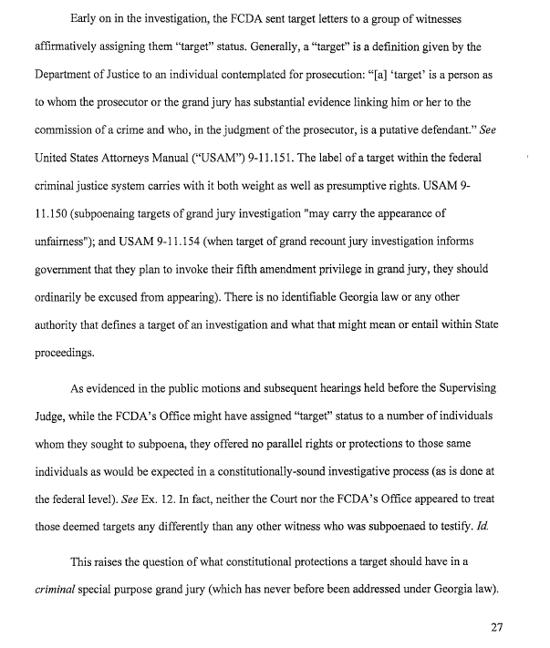 The DA identified certain people as "targets" in this investigation. That label is important; the DOJ typically assigns it when they have substantial evidence linking someone to a crime. The term carries some presumptive rights with it, such as exclusion from testifying in front… twitter.com/i/web/status/1…