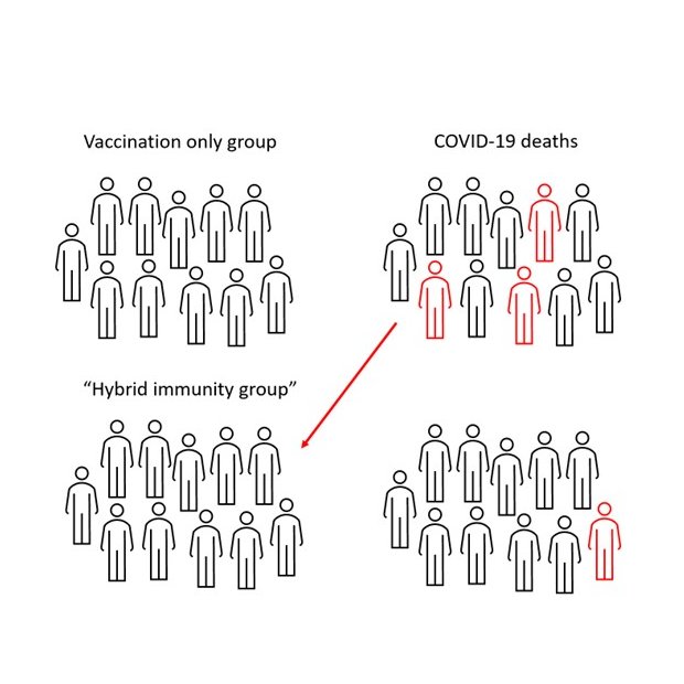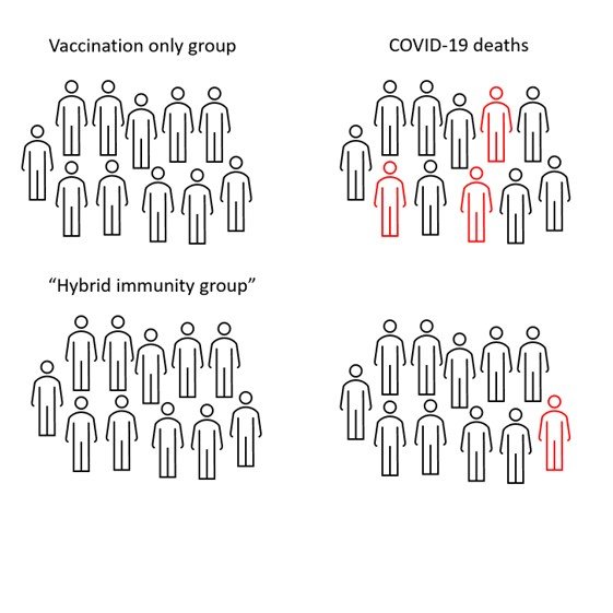 What we need to remember about the hybrid immunity group is that to become the hybrid immunity group, they had to first be the vaccinated only group. And *dead people can't die twice*. So the hybrid group is actually the vaccinated-only group *after selecting out the dead people*