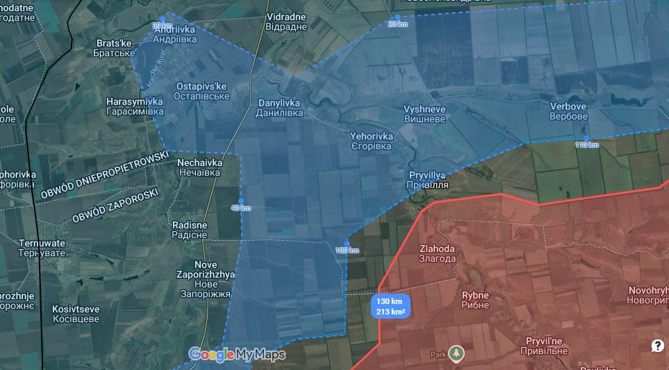 Biłohirja na wschód od Orichiw. Rosjanie lokalnie podjęli małe działania ofensywne zajmując obszar szarej strefy i uderzając na wieś Biłohirja. Obecnie trwają tam walki. Miejscowość jest dobrze broniona przez Ukraińców. 3/