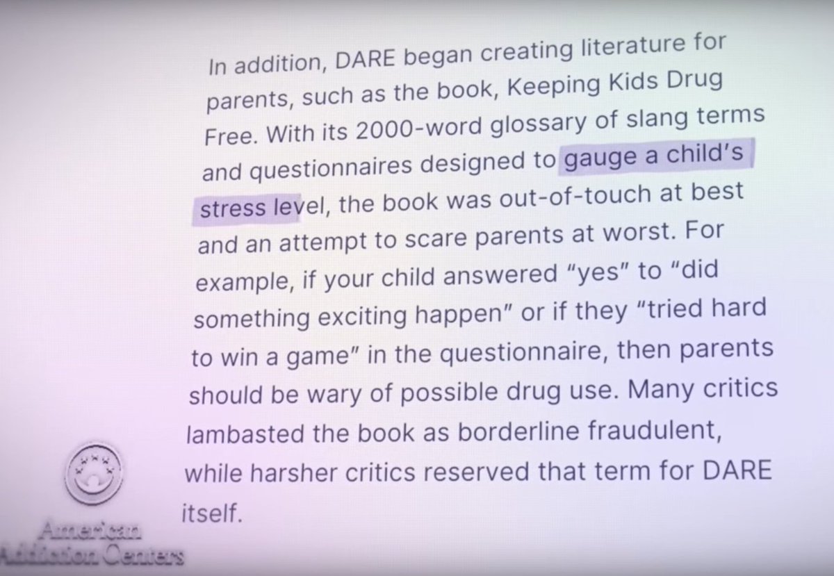 "Keeping Kids Drug Free", a book distributed by DARE, contained a questionnaire that gauged a child's stress level/ potential for drug use. If they answered yes to "did something exciting happen" or "tried hard to win a game", they were 'at risk'.