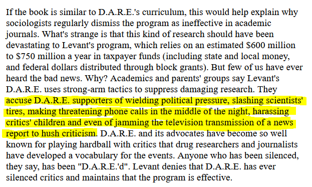 DARE was designed to be pro kid & pro cop. As such, any criticism was met with vitriol. There are even reports of reporters/academics receiving threatening calls, having tires slashed, and even jamming a TV transmission airing criticism.