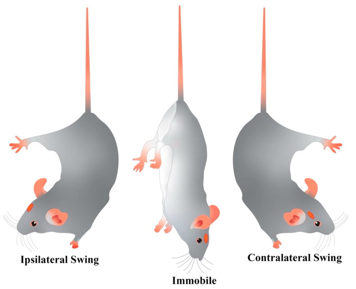 Suspensión de cola: más usada en ratones. Al levantarlos de la cola, harán todo el esfuerzo por escapar. Después de cierto tiempo🐁 queda inmóvil. Los animales deprimidos, permanecen más tiempo inmóviles que los no deprimidos. Esto también se revierte con antidepresivos.