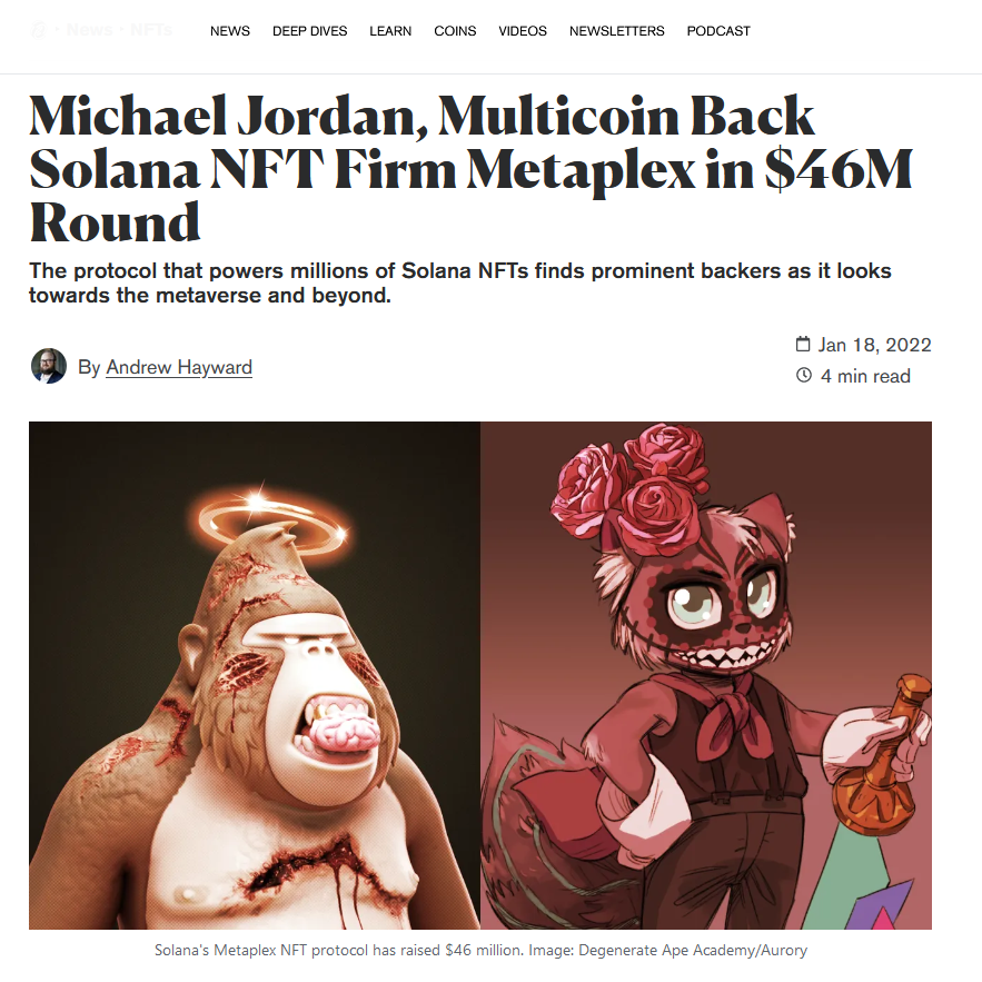"Metaplex Foundation ..has raised $46 M in a round co-led by Multicoin Capital & Jump Crypto, w/ Solana Ventures, Alameda Research &metaverse investment firm Animoca Brands"
