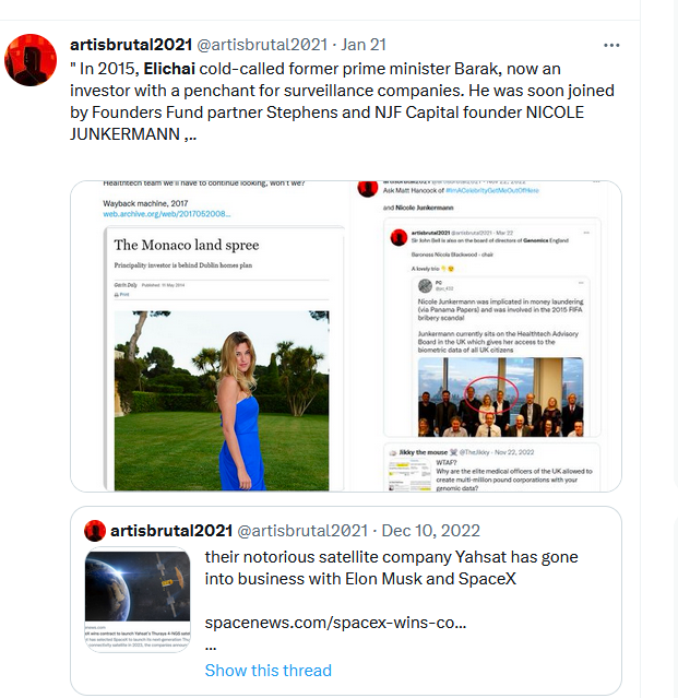 Barak was soon joined by Founders Fund partner Stephens & Nicole Junkermann, advisors like .. Michael Chertoff, ex-commissioner of the Met Police Lord Bernard Hogan-Howe, and a roster of Israeli surveillance veterans.."