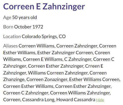 Now here goes the gaslighting. Correen Williams is her maiden name. Correen Williams and Correen Zahnzinger are the same. Esther is her middle name.