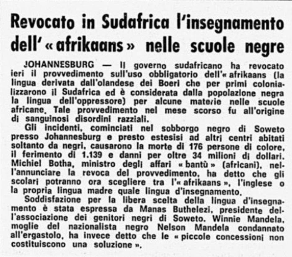 Tempo prima aveva emanato un decreto che rendeva obbligatorio l'uso dell'Afrikaans (una lingua figlia dell’olandese) come mezzo di istruzione nelle nostre scuole.