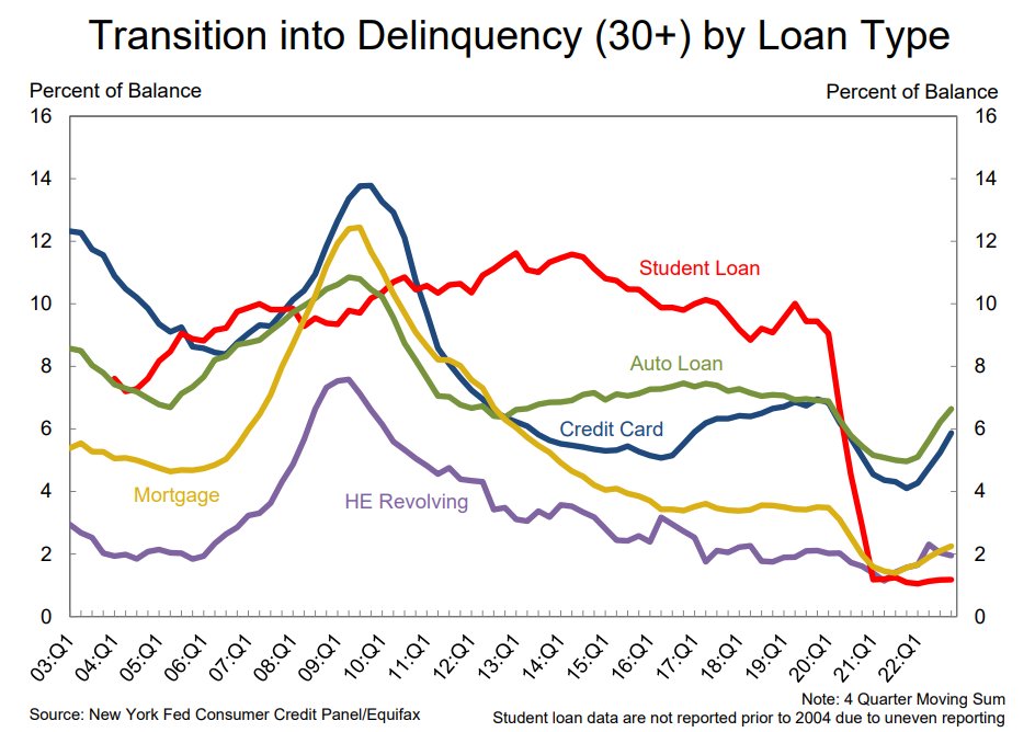 🇺🇸 Data also show consumers have ramped use of credit to maintain consumption. Credit card balances hit a record high in 4Q while the share of credit card users making payments that were at least 30 days late ⬆ to 5.9% from 5.2% prior. (4/8) newyorkfed.org/medialibrary/i…
