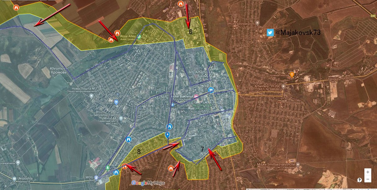 12\#ucraina Partendo dalla zona 6, russi sono impegnati nella zona industriale di bakhmut, piena di tunnel ed impianti. Abbiamo già visto in passato la difficoltà di prendere questi impianti di struttura sovietica. Possibili linee di ripiegamento sono lungo la ferrovia