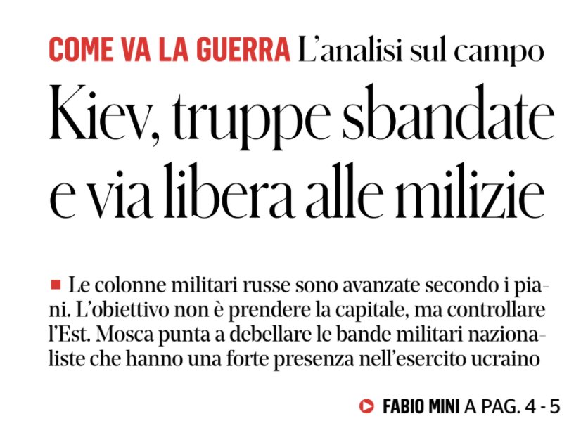 Due giorni fa il generale Mini descriveva sul Fatto il successo dell’“operazione speciale” di Putin in Ucraina: “Il ‘rallentamento’ che i nostri ‘esperti’ attribuiscono alla cattiva logistica è solo la conseguenza di aver raggiunto gli obiettivi”. Siamo a: Putin ha già vinto. 1/n