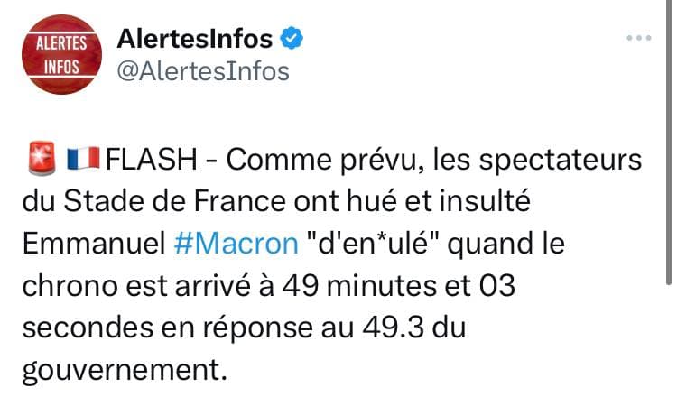 ⏩Des "Macron démission !" ont été scandés par une partie du public du Stade de France à la 49eme minute et 3eme seconde de jeu