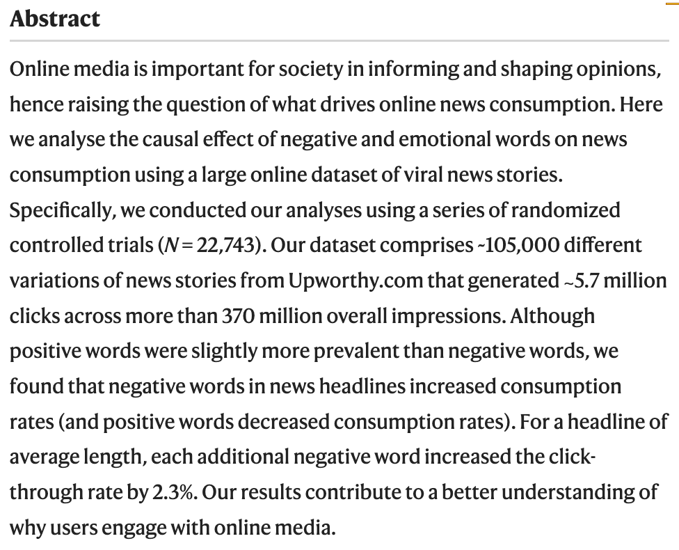 Blended study of 105,000 headlines and 370 million impressions concludes "each additional negative word [in a headline] increased the click-through rate by 2.3%"