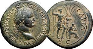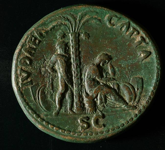 Paranın arka yüzünde hurma ağacı ve altında üzgün, çaresiz bir Yahudi etrafında mağrur Roma askeri görünüyor. Üzerinde Latince ''Judea Capta'' Jueda ele geçirildi yazılı.