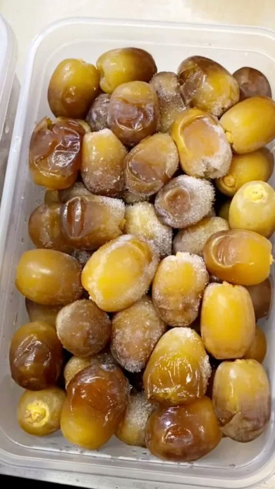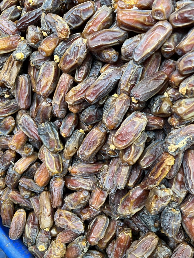 Bizim Türkiye'de yaygın olarak tükettiğimiz hurma cinsi olan Mebrum cinsi hurma bu. Çok sert ve kuru, raf ömrü uzun, çinko ve potasyum zengini bir hurma. Ben de severek yiyorum. Bu hurmayı eskiden Araplar deve ve keçilere yem olarak veriyordu. Biz talep gösterince durum değişti.