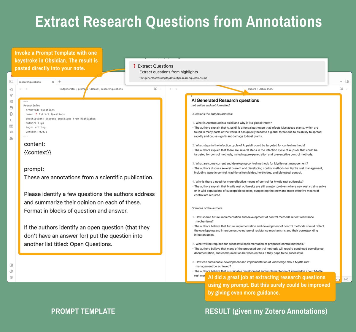 1. annotate PDFs in @zotero 2. import them into our notes in @obsdmd 3. work with ChatGPT directly in Obsidian using PROMPT TEMPLATES. 4. Use ChatGPT to write research publications.