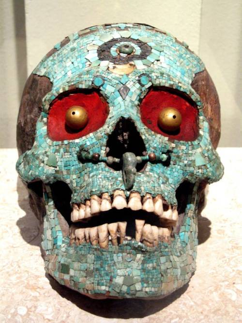 An Aztec skull from Tonalá covered with turqoise mosaic, gold eyes and a jade ornament in the forehead. 1300-1521 CE, now housed at the Archeological Museum of Soconusco in Mexico. wilwheaton.tumblr.com/post/712759299…