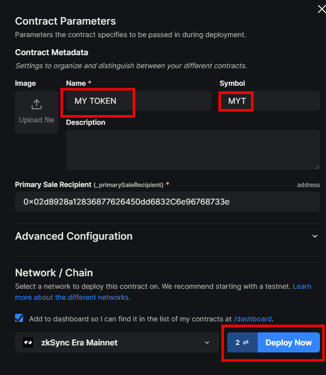 - Write a name and a symbol for your token. Then click Deploy Now and Sign the 2 transactions (free). https://t.co/yIhBgErdKSthirdweb.com/thirdweb.eth/T…