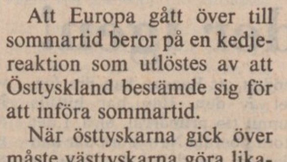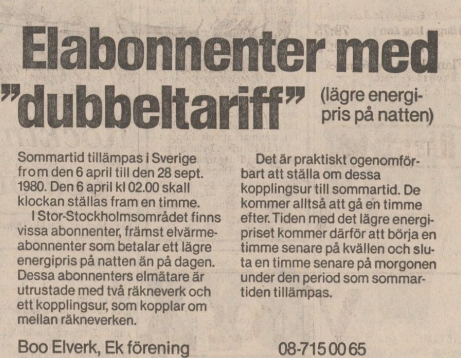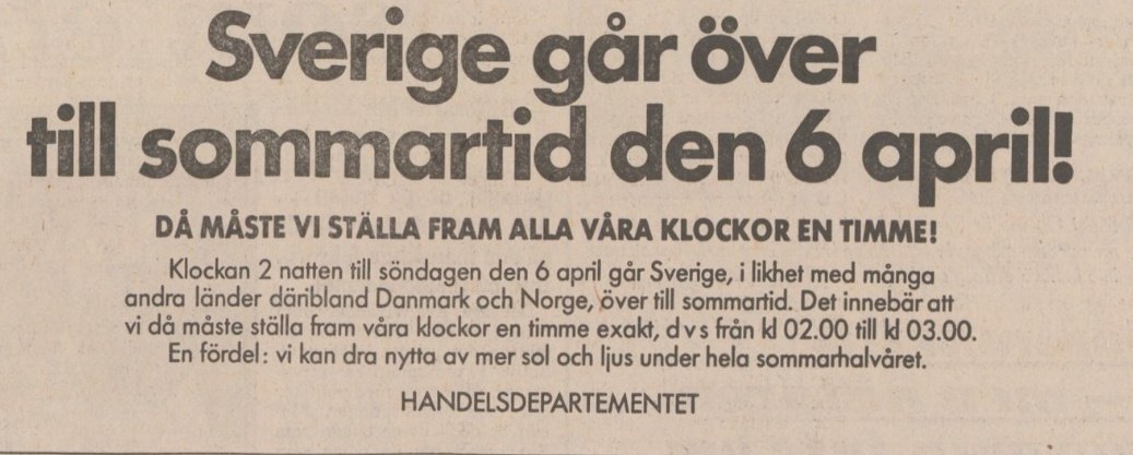 Den första söndagen i april 1980 ställde svenskarna kollektivt om klockan en timme. Sedan rådde sommartid fram till sista söndagen i september. Året därefter var det istället sista söndagen i mars som var dagen för sommartidens införande vilket det varit sedan dess.