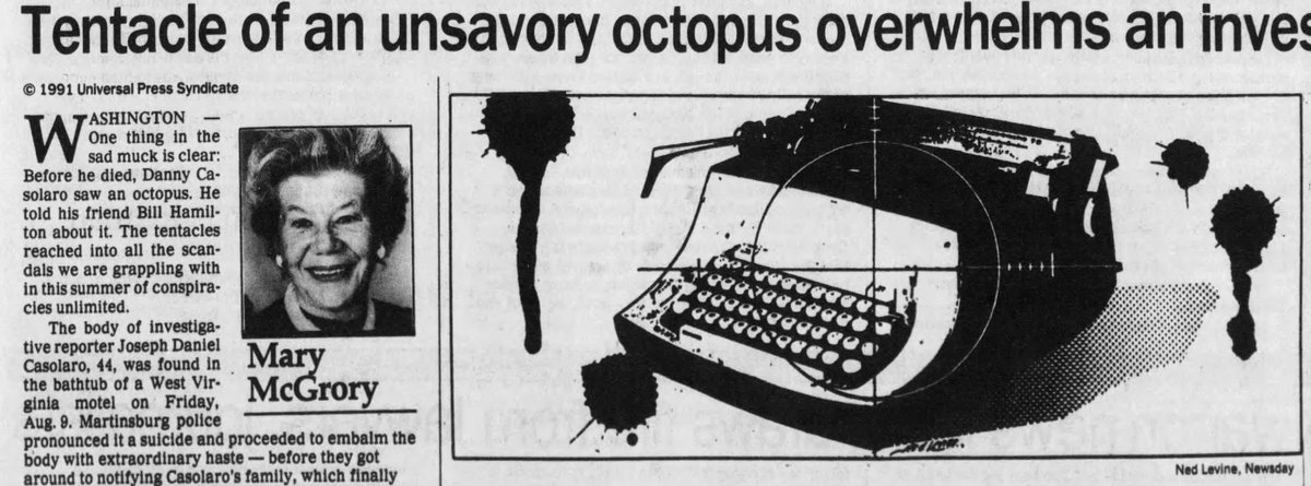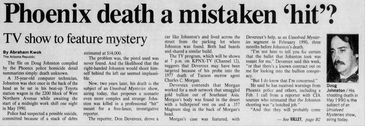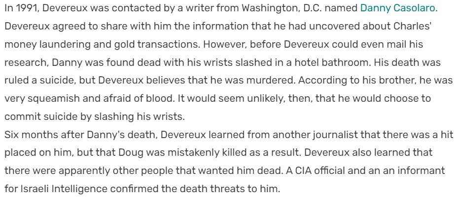 A year after Johnston's death, Devereux was contacted by Danny Casolaro, of PROMIS fame, and agreed to share with him the info he had uncovered on Morgan's gold transactions. He never did get to pass this info along before Casolaro was found dead of an apparent "suicide".