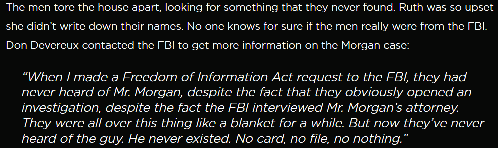 Devereux attempted to obtain Morgan's FBI files via a FOIA request, but was told the agency had no files on him, despite their involvement in his case.