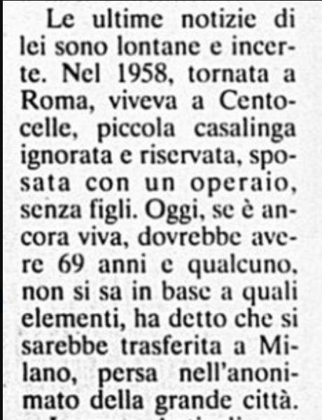 Il saggista Silvio Bertoldi, in un articolo sul Corriere del 1994, scrive: “Oggi, se è ancora viva, dovrebbe avere 69 anni”.