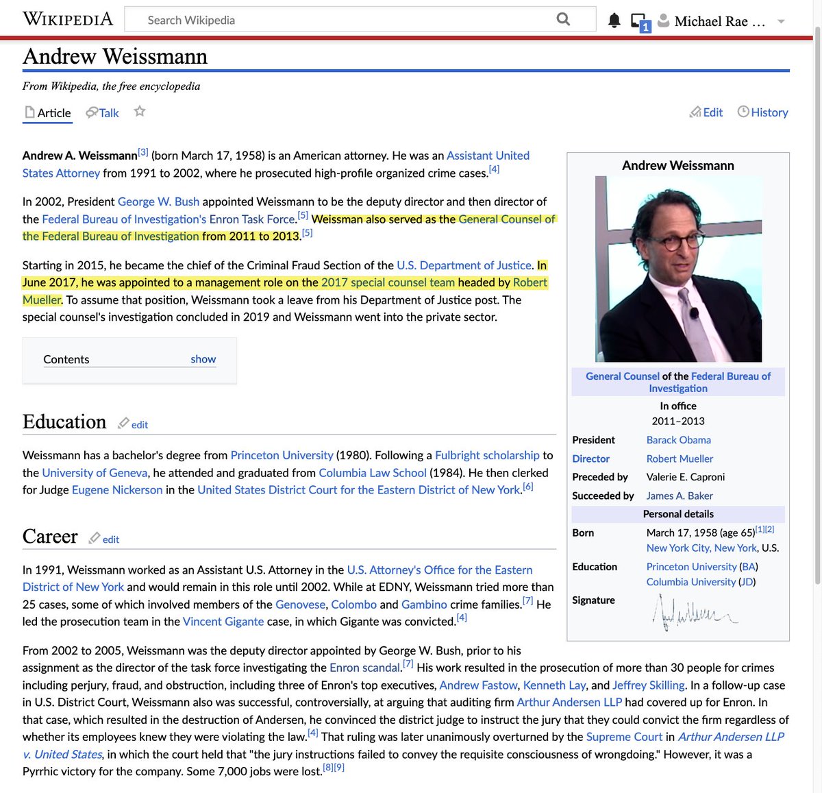 In June 2017, he was appointed to a management role on the 2017 special counsel team headed by Robert Mueller.