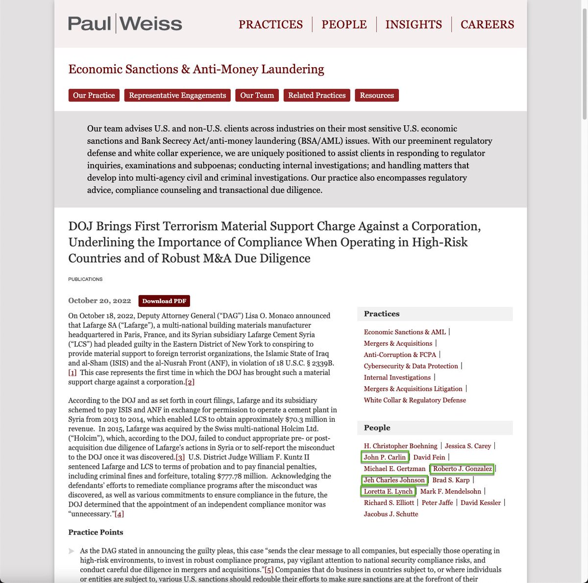 Loretta Lynch, John Carlin, Jeh Johnson & Roberto Gonzalez are all Partners at the firm & were directly involved with prosecuting the First Corporate Material Support for Terrorism Prosecution of Lafarge S.A - where HRC was once a Director.