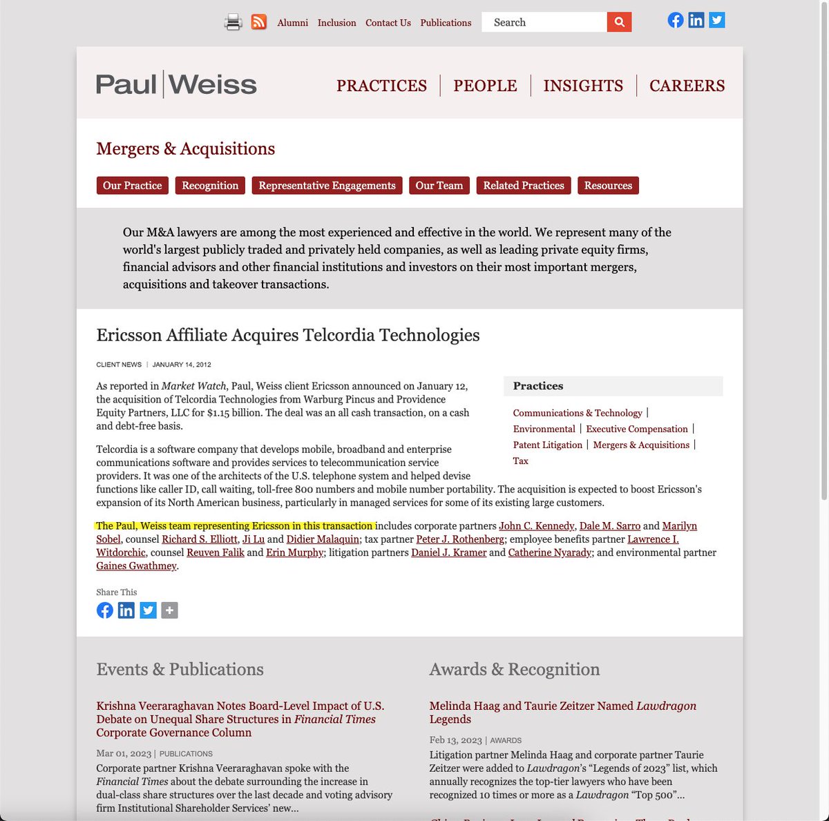 His firm handled the NeuStar-Telcordia deal (Paul | Weiss represented Ericsson) in 2011-12 acquisition.