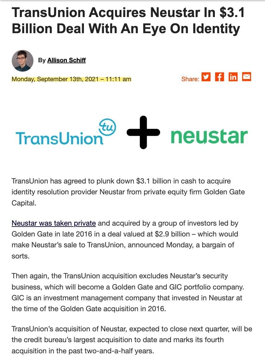 TransUnion (the third largest Credit Bureau) agrees to acquire identity resolution provider NeuStar for $3.1B from private equity firm Golden Gate Capital.