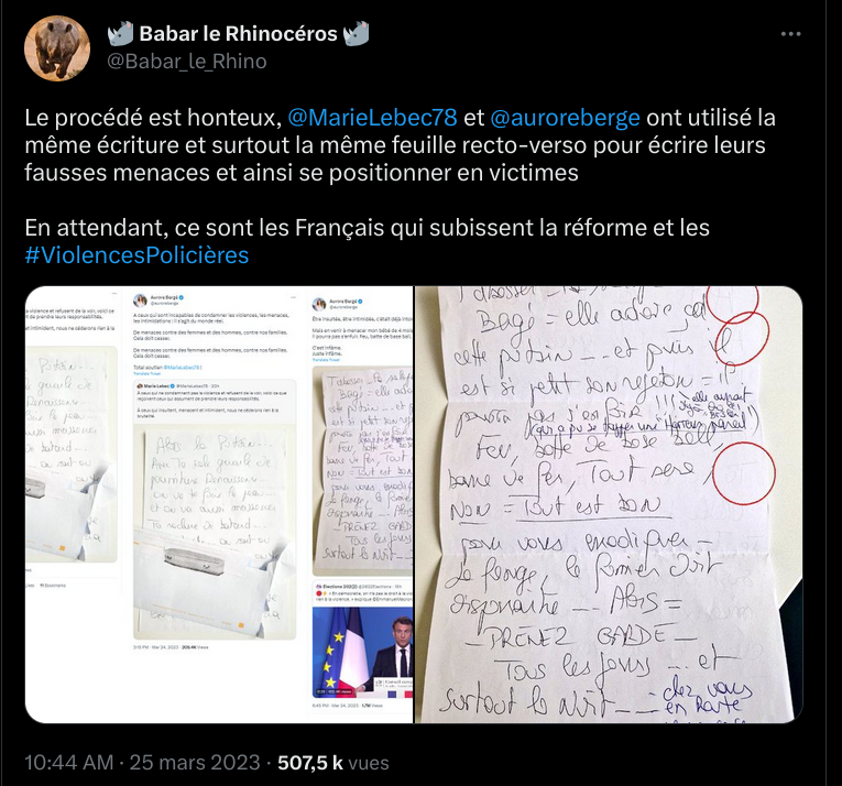 On a d'abord une députée macroniste qui publie un tweet avec une lettre d'insultes et de menaces, partiellement cachée.