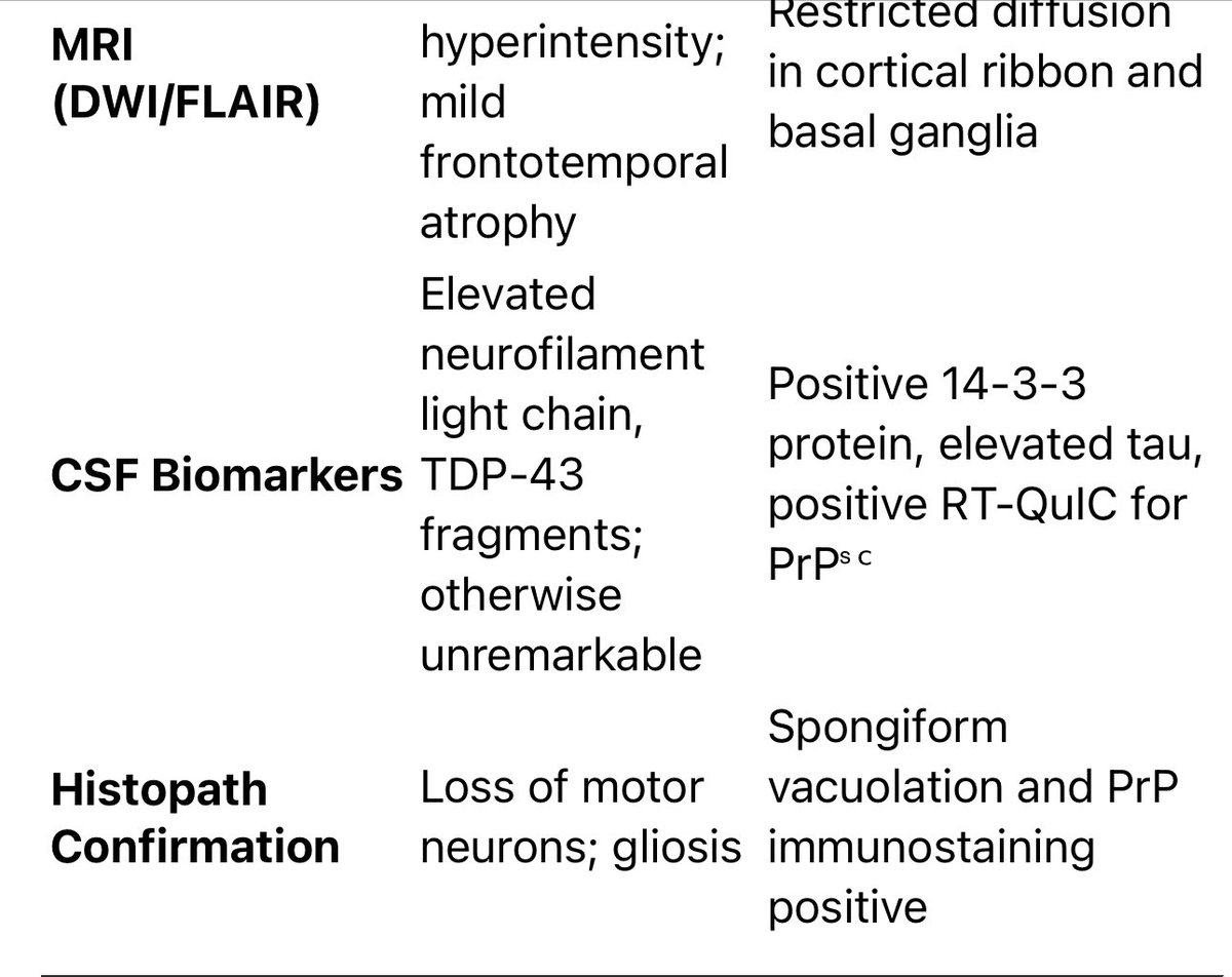 •Symptoms: rapid cognitive decline, myoclonus, cortical ribboning on MRI, positive RT-QuIC.