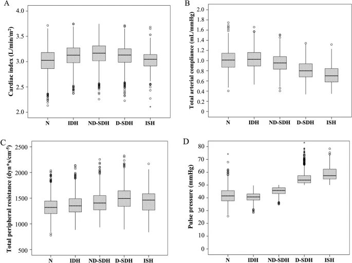 Se analizó la hemodinámica arterial según los subtipos de HTA en 7434 individuos (5523 HTA sin tratar y 1950 controles normotensos [N]). La edad media de los individuos fue de 46,2 ± 13,0 años; El 54,8% eran hombres y el 22,1% eran obesos.
