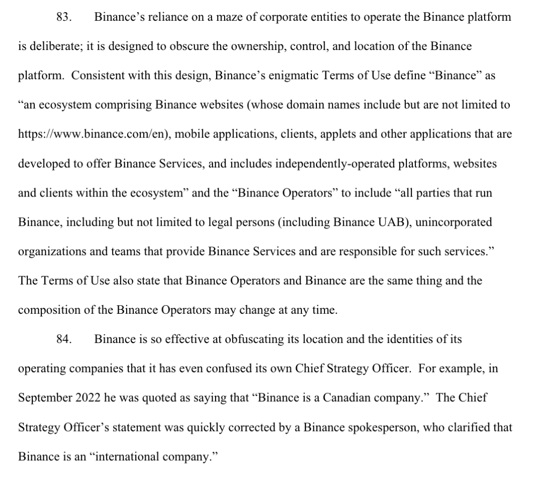 "Binance's reliance on a maze of corporate entities to operate the Binance platform is deliberate; it is designed to obscure the ownership, control, and location of the Binance platform."
