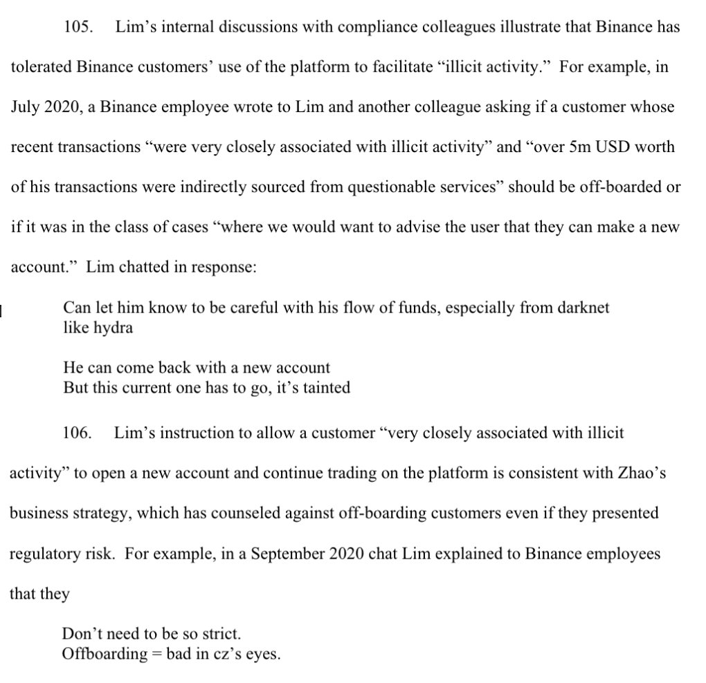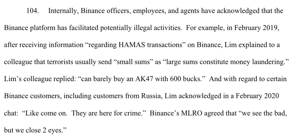 "Lim acknowledged in a February 2020 chat: 'Like come on. They are here for crime.' Binance's [Money Laundering Reporting Officer] agreed that 'we see the bad, but we close 2 eyes.'"